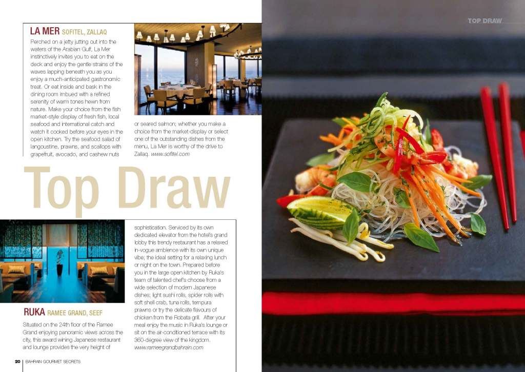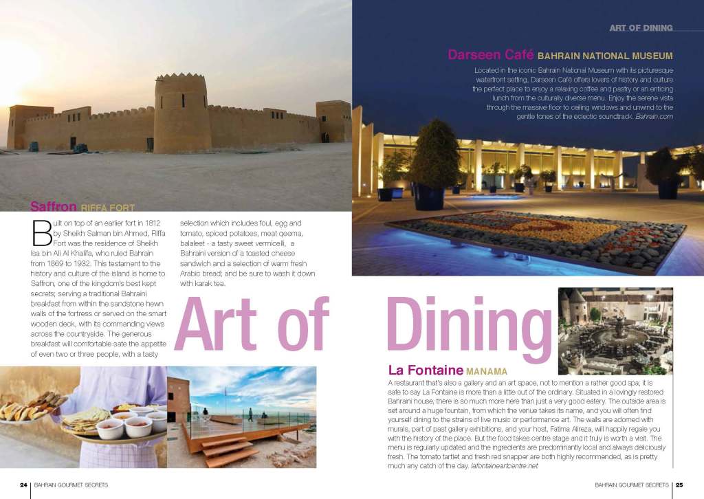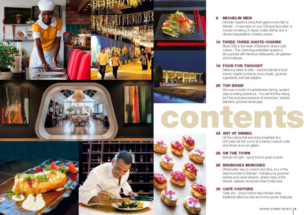 Bahrain Gourmet Secrets is a 40-page A5 size booklet that contains the directory of all the high-end restaurants in the Kingdom of Bahrain with the partnership of Tourism Affairs.